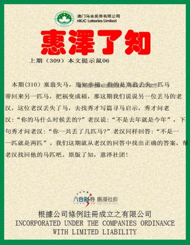 | [惠泽了知] 310期:塞翁失马,焉知非福,指的是塞翁丢失一匹马带回来另一匹马,解明肖马。把祸变成福,那这期我们说说另一位丢马的老汉,老汉解男肖鼠牛虎龙马猴狗。这位老汉丢失了马,去找秀才写篇寻马启示,秀才解肖虎龙猪马。秀才问老汉:“你的马什么时候丢的?”老汉说:“不是去年就是今年”,下句秀才问老汉:“你一共丢了几匹马?”老汉同样回答:“不是一一匹就是两匹”。我们这期就从老汉的回答中找出正确的答案,帮老汉找回他的马匹吧。 [惠泽九肖]:马鼠牛虎龙猴狗蛇鸡 [惠泽六肖]:马鼠牛虎龙猴 [惠泽平尾]:4444尾 |