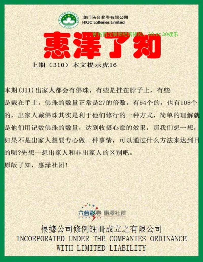 | [惠泽了知] 311期:出家人都会有佛珠,有些是挂在脖子上,有些是戴在手上,解佛肖牛虎龙蛇猴。佛珠的数量正常是27的倍数,有54个的,也有108个的,出家人戴佛珠其实是利于他们修行的一种方式,出家人解肖虎马猴猪。简单的理解就是他们用记数佛珠的数量,达到收摄心意的效果,那我们想一想,如果不是出家人想要专心做一件事情,可以通过什么方法来达到目的呢?先想一想出家人和非出家人的区别吧。 [惠泽九肖]:牛虎龙蛇猴马猪羊鸡 [惠泽六肖]:牛虎龙蛇猴马 [惠泽平尾]:9999尾 [惠泽特码]:29 41 16 28 26 38 13 37 22 46 |