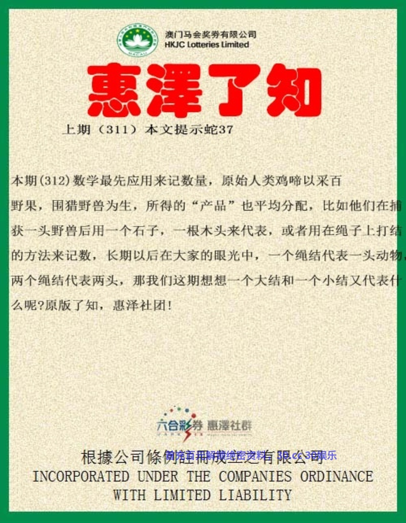 | [惠泽了知] 312期:数学最先应用来记数量,原始人类鸡啼以采百野果,围猎野兽为生,解明肖鸡,野肖鼠虎兔龙蛇猴。所得的“产品”也平均分配,比如他们在捕获一头野兽后用一个石子,一根木头来代表,或者用在绳子上打结的方法来记数,长期以后在大家的眼光中,一个绳结代表一头动物两个绳结代表两头,那我们这期想想一个大结和一个小结又代表什么呢? [惠泽九肖]:鸡鼠虎兔龙蛇猴马狗 [惠泽六肖]:鸡鼠虎兔龙蛇 |