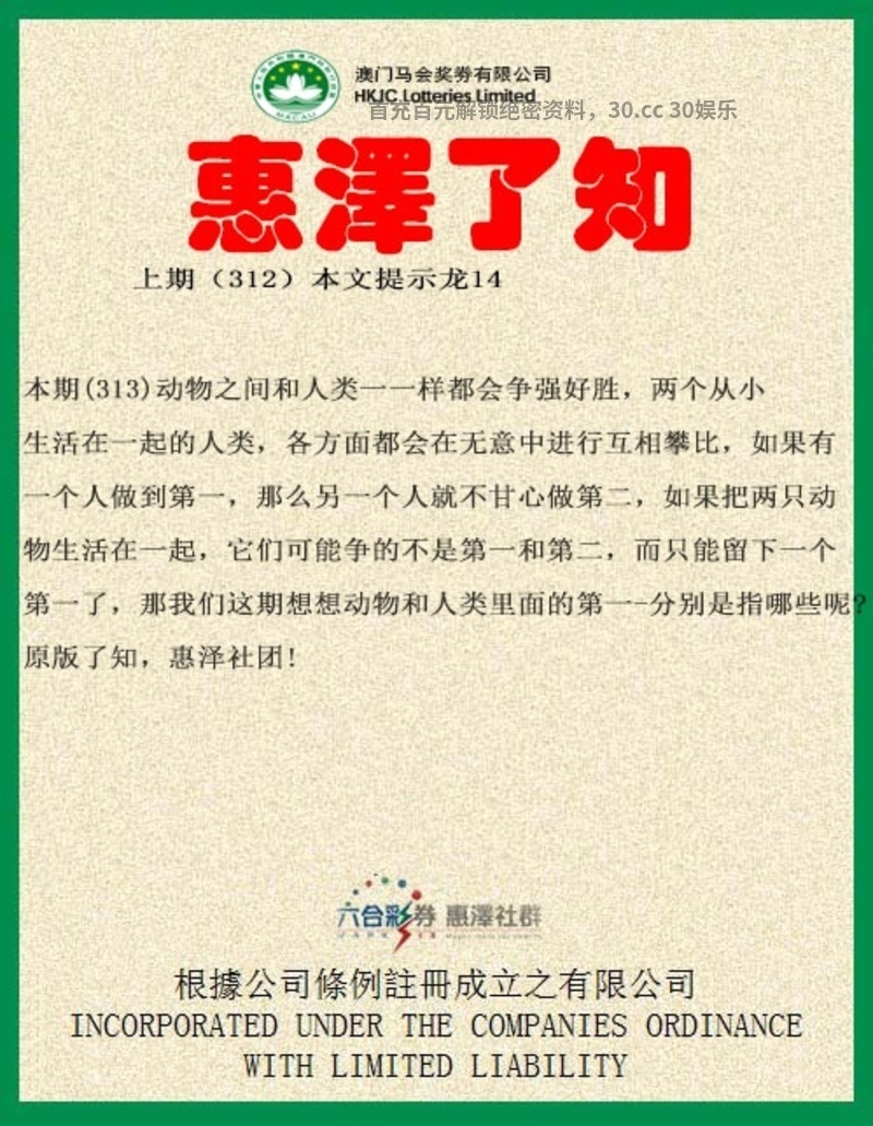 | [惠泽了知] 313期:动物之间和人类一一样都会争强好胜,解肖虎狗马牛。两个从小生活在一起的人类,从小解小肖鼠兔龙蛇猴鸡。各方面都会在无意中进行互相攀比,如果有一个人做到第一,那么另一个人就不甘心做第二,如果把两只动物生活在一起,它们可能争的不是第一和第二,而只能留下一个第一了,那我们这期想想动物和人类里面的第一-分别是指哪些呢? [惠泽九肖]:虎狗马牛鼠兔龙蛇猴 |