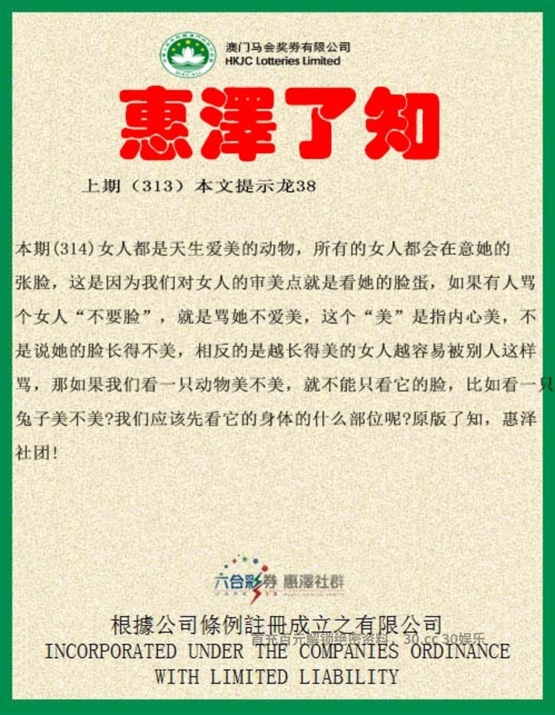 | [惠泽了知] 314期:女人都是天生爱美的动物,解女肖兔蛇羊鸡猪。美肖兔龙蛇马羊鸡。所有的女人都会在意她的张脸,这是因为我们对女人的审美点就是看她的脸蛋,如果有人骂个女人“不要脸”,就是骂她不爱美,,这个“美”是指内心美,不是说她的脸长得不美,相反的是越长得美的女人越容易被别人这样骂,那如果我们看一只动物美不美,就不能只看它的脸,比如看一只兔子美不美?我们应该先看它的身体的什么部位呢? [惠泽九肖]:兔蛇羊鸡猪龙马牛狗 [惠泽六肖]:兔蛇羊鸡猪龙 [惠泽三肖]:兔蛇羊 |