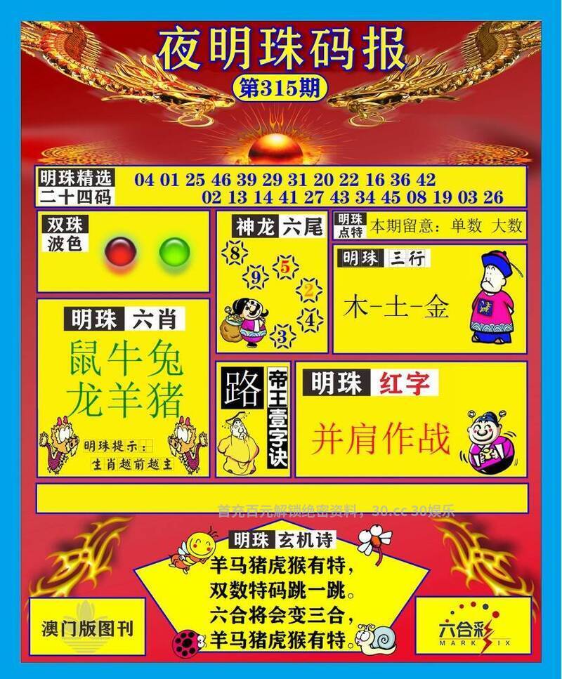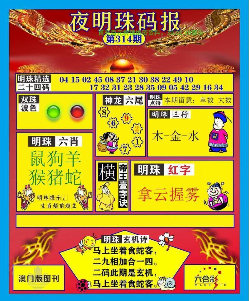 | 315期:玄机诗 羊马猪虎猴有特,双数特码跳一跳。六合将会变三合,羊马猪虎猴有特。 精选六肖:鼠牛兔龙羊猪 精选六码:18 17 03 02 35 43 |